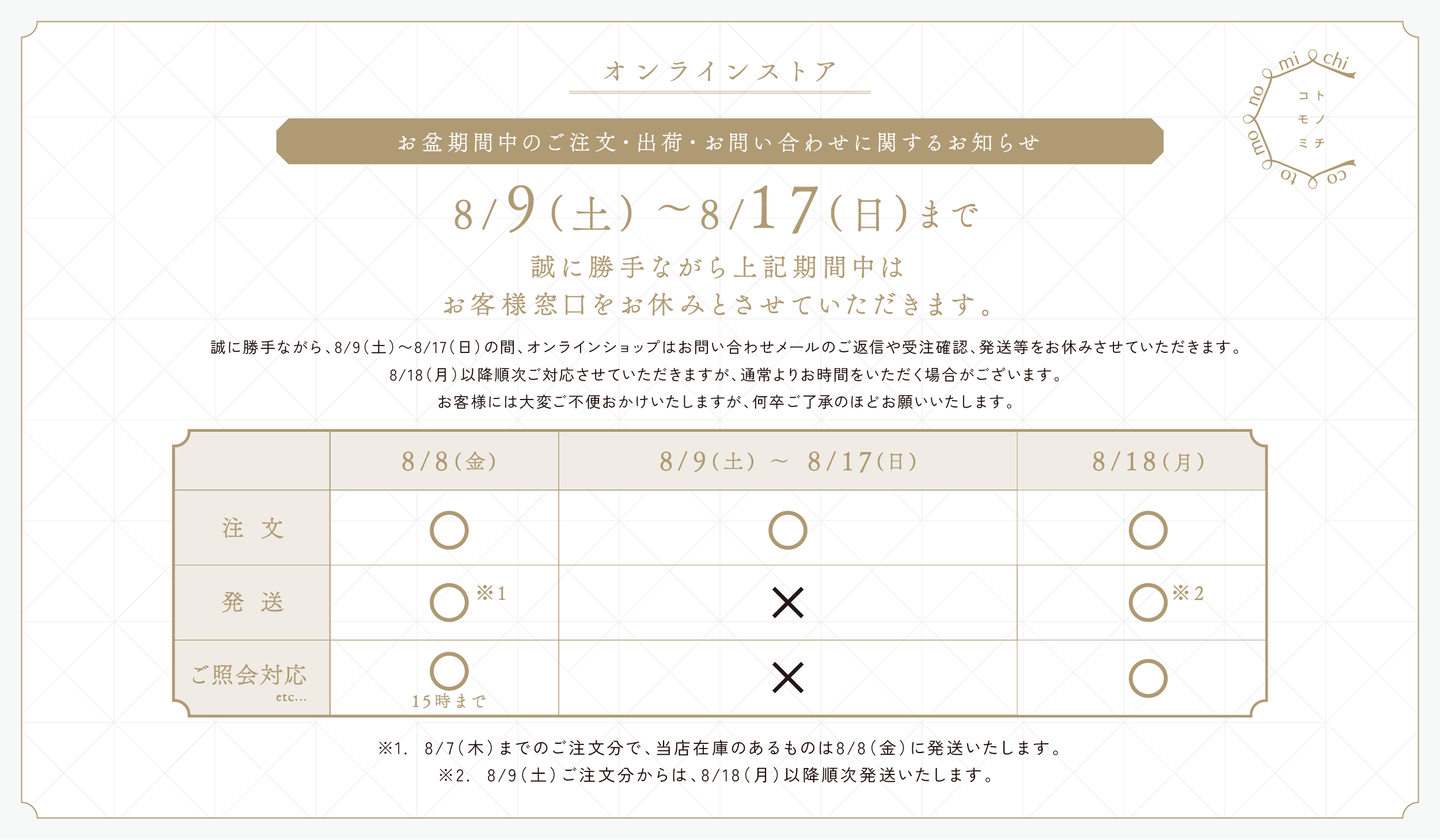 ご注文の受付は休業期間中も可能ですが、発送やお問い合わせへのご返信は8月18日(月)営業再開後、順次ご対応させて頂きます。